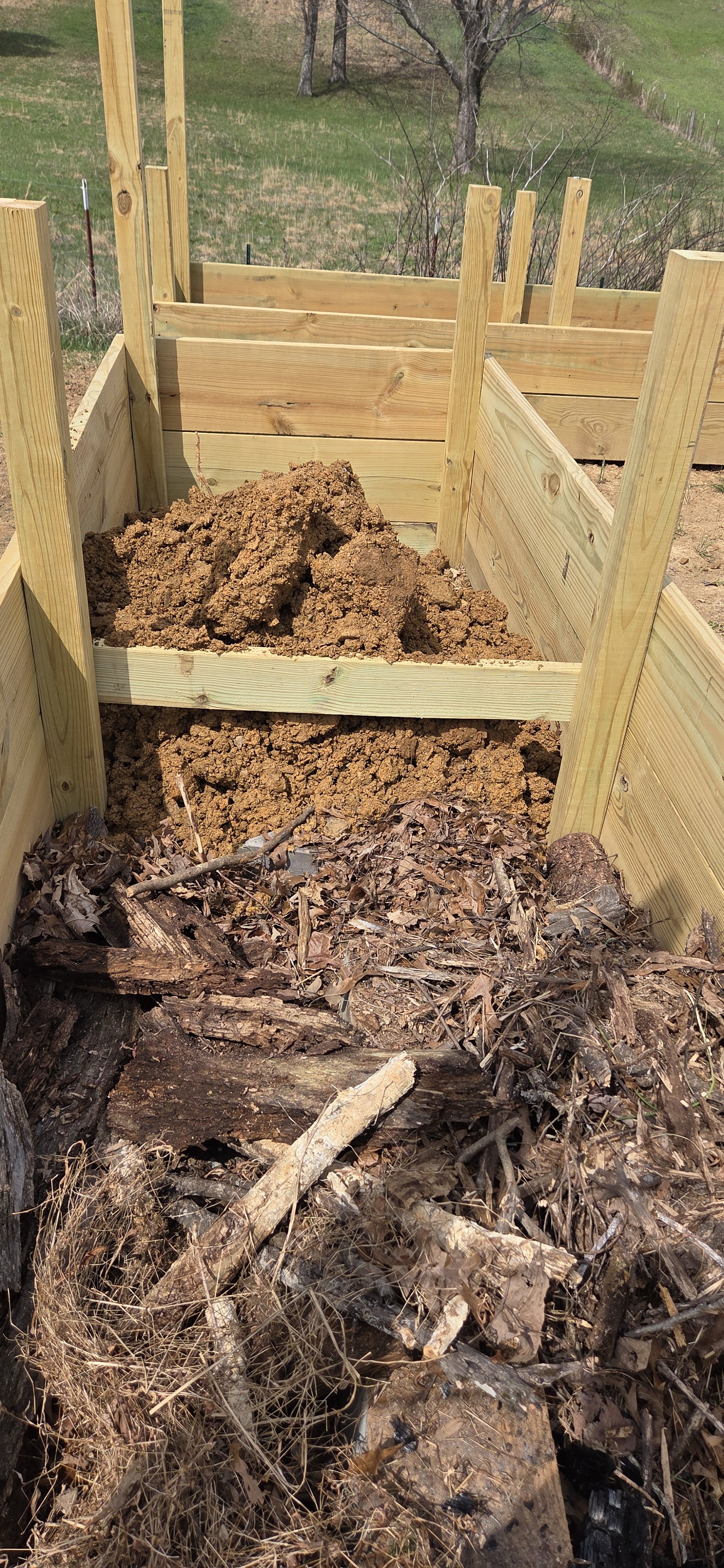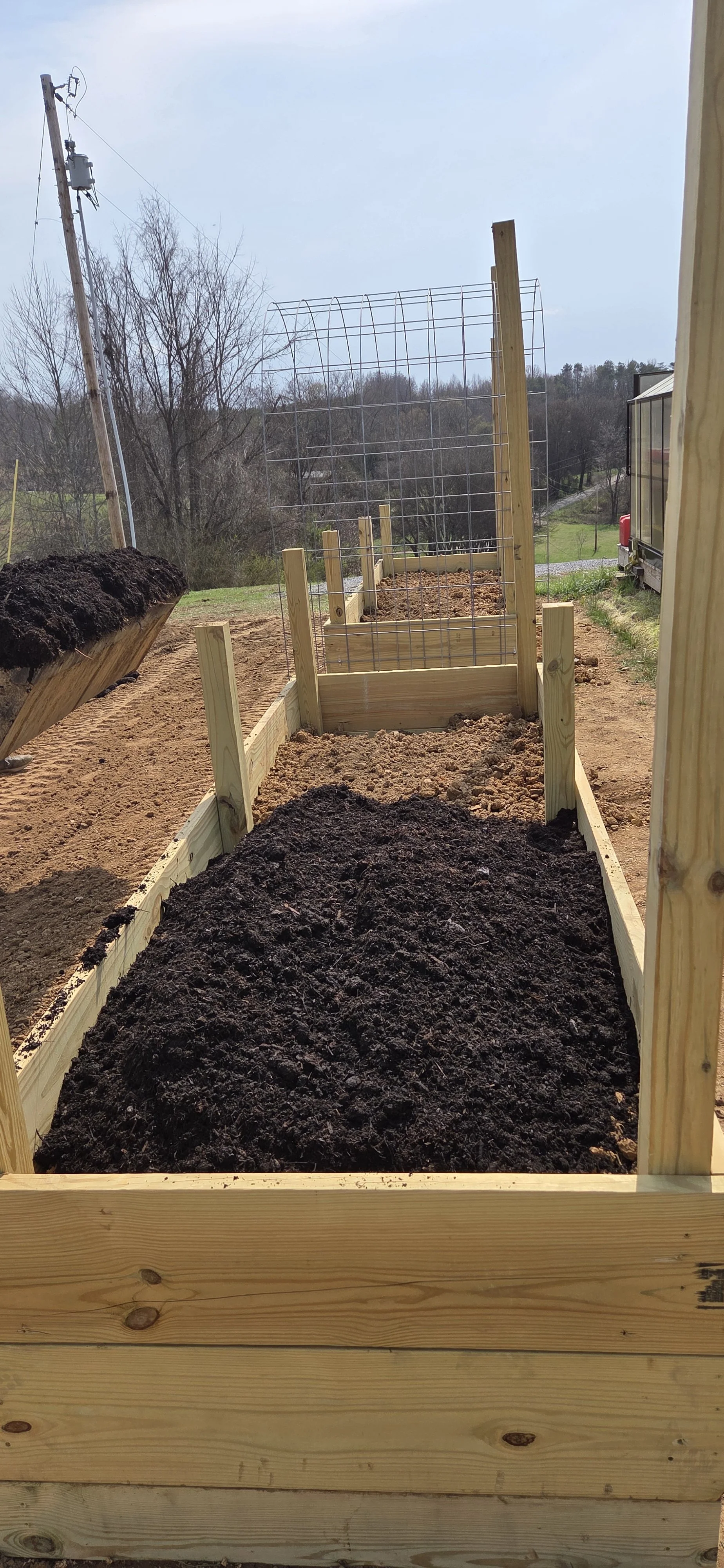 The lowest layer contains tree bark, sticks, and decaying logs from the forest surrounding our farm. The next layer is typical Greeneville dirt that is largely comprised of dense, red, clay. The top layer is a beautiful blend of topsoil and mushroom soil that is a lovely dark color, finely ground texture, and rich in nutrients.